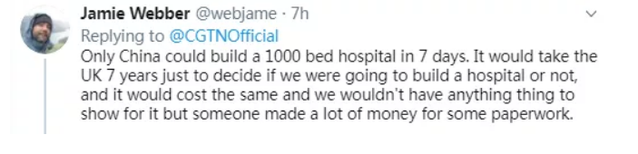 “只有中国才能在7天内修建一个容纳1000张床位的医院了!这在英国,花上7年的时间也就只够决定到底能不能建造一个医院.......”