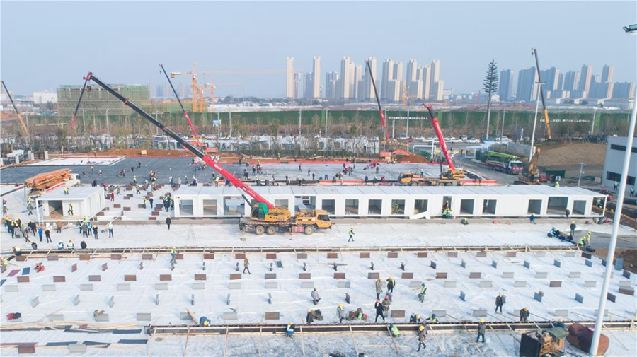 1月25日,由中国建筑中建三局牵头建设的武汉火神山医院正式开工,医院总建筑面积3.39万平方米。截至1月29日下午16时,火神山医院项目现场场地平整和回填全部完成,板房基础混凝土浇筑完成约90%,已经完成300多个箱式板房骨架安装,同时场外正在抓紧板房拼装,完成约400个,吊至现场可直接安装。水电暖通、机电设备等材料全面到位,且同步开始作业。