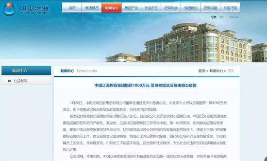 1月28日,中国泛海控股集团有限公司董事会通过武汉市慈善总会,向武汉市人民政府捐赠第一期1000万元资金,用于驰援武汉抗击新型冠状病毒感染的肺炎疫情。
