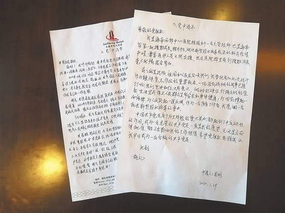 1月29日,两份来自湖北战“疫”前线上的入党申请书照片传回了海南。照片里,两张酒店便笺纸上写着密密的文字——这是海南首批援鄂医疗队队员叶智超、苏日多的入党申请书。