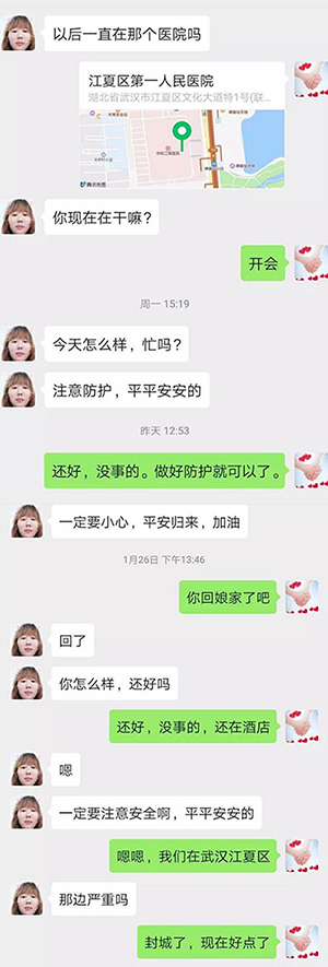 不能回去陪我爱人,让她一个人在老家,真觉得对不住她。今天和爱人打电话报了平安。我说我在武汉挺好的,吃的住的都挺好的,不用担心,住的这边离支援的医院也很近,走路过去就可以了。她说:“其实我现在不担心你吃住问题,吃住差点都没事儿,我最最担心的是你的安全和健康,要把口罩戴好,一定要做好防护!注意按时吃饭,平平安安地回来就行!”她说得最多的就是平安,语气里充满了关心,没有一丝埋怨。有着这样强大的后盾,我更能够全身心投入到一线工作中去。