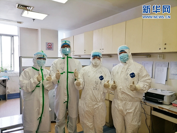 身穿防护服的曾茄与同事们。(图片由四川省援鄂医疗队前方宣传组提供)