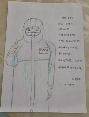 “妈妈,我想你,但是我不哭。我知道你也许在救别人的妈妈,那么我只希望,让所有的妈妈都能平安回家。”这是山西援鄂医疗队成员、山西省中医院重症医学科护士王芳10岁的女儿王潇婉画的一幅手绘。