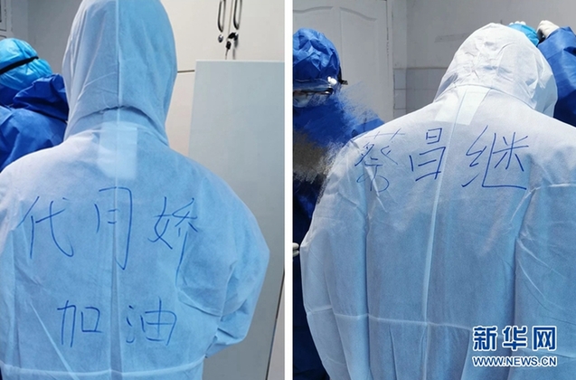 医护人员在防护服背后写上自己的名字。新华网发(受访者供图)