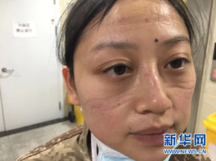 下班后解雨被护目镜压过的脸。新华网 发(受访者供图)
