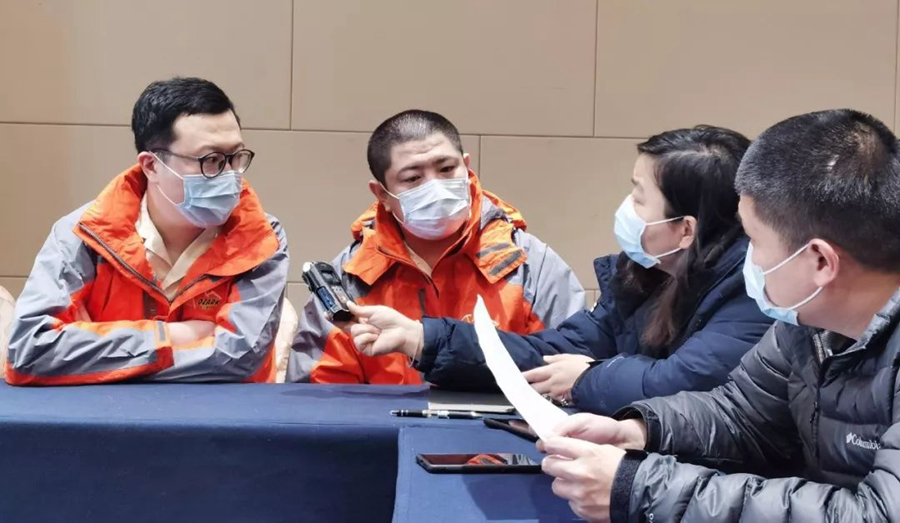 关宏奎(左二)和同事一起接受本台记者劲清的采访