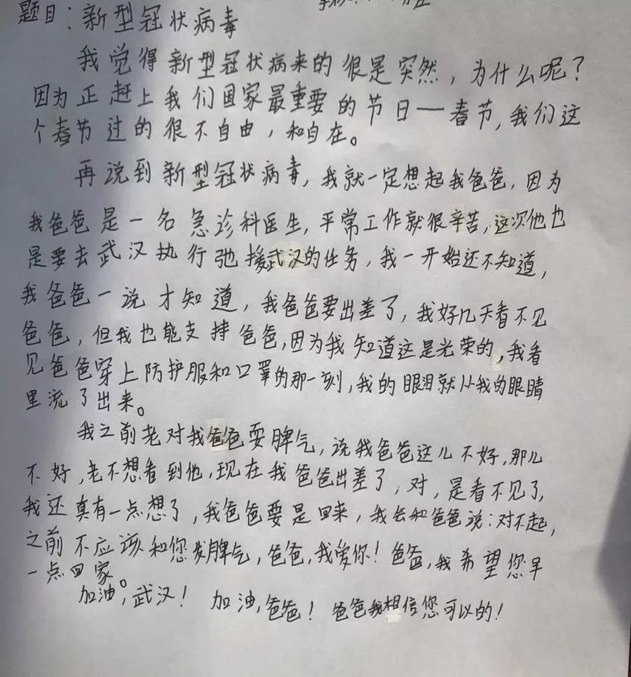 信里他先反思了一下自己,说以前盼望着爸爸上班,不希望爸爸在家管他。现在爸爸去前线,我想到危险性,现在又特别希望爸爸安安全全地回家,然后还说了一句,爸爸我爱你!以前从来没有过。我跟他说,我希望你在生活和学习中面对困难,无所畏惧,一直向前,我还说爸爸不一定是你的骄傲,但一定要做你的榜样。