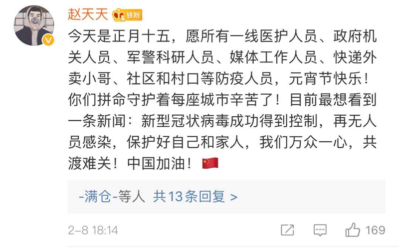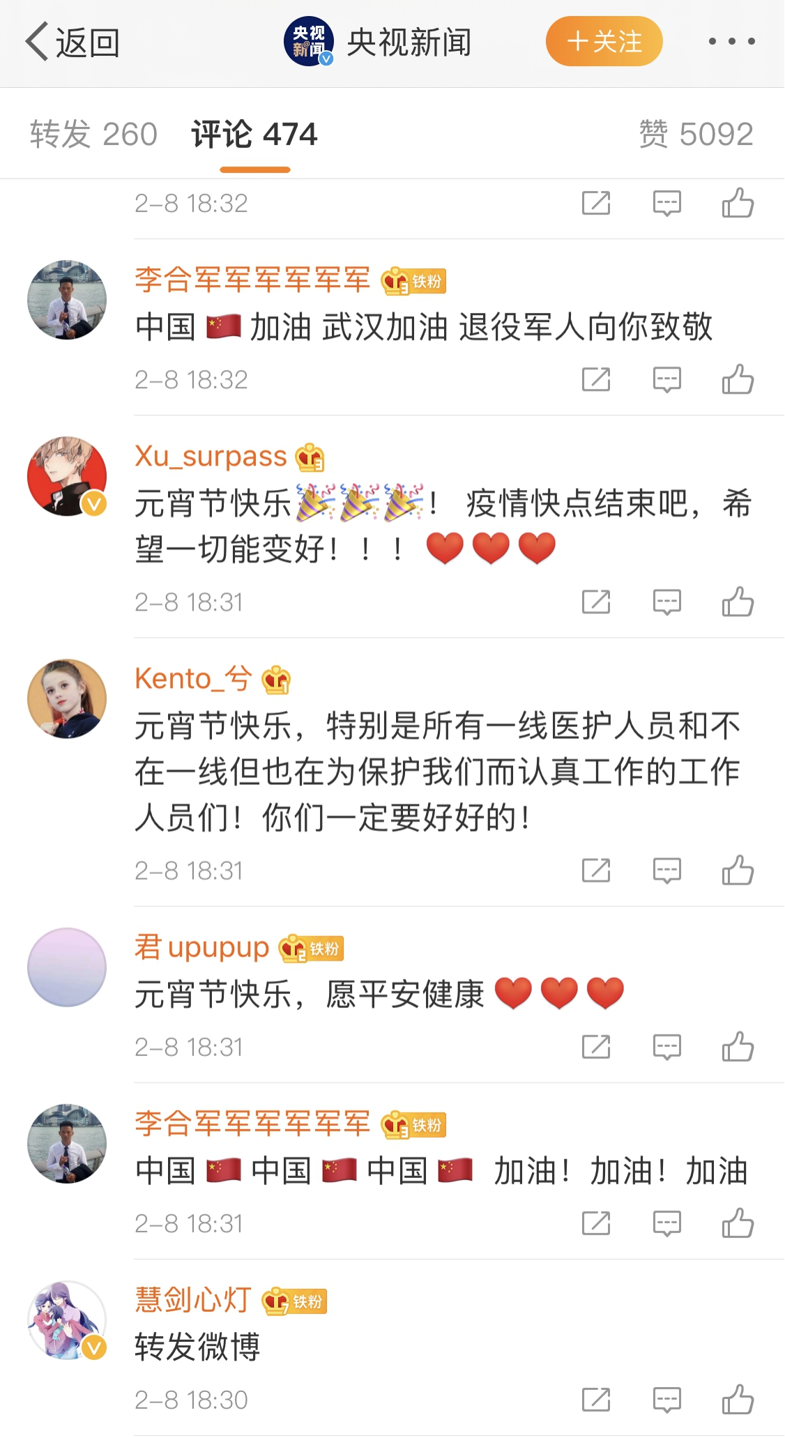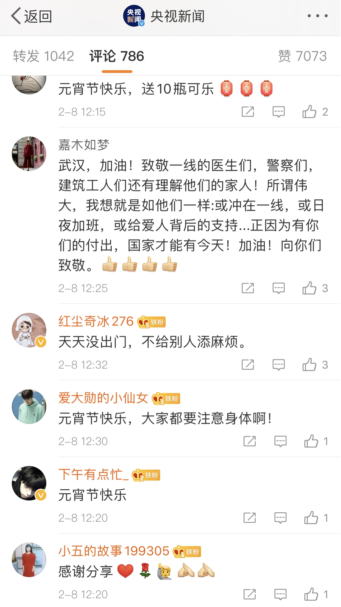 网友赵天天:“今天是正月十五,愿所有一线医护人员、政府机关人员、军警科研人员、媒体工作人员、快递外卖小哥、社区和村口等防疫人员,元宵节快乐!你们拼命守护着每座城市辛苦了!目前最想看到一条新闻:新型冠状病毒成功得到控制,再无人员感染。保护好自己和家人,我们万众一心,共渡难关!中国加油!”