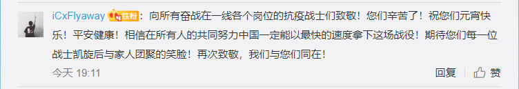 iCxFlyaway:向所有奋战在一线各个岗位的抗疫战士们致敬!您们辛苦了!祝您们元宵快乐!平安健康!相信在所有人的共同努力中国一定能以最快的速度拿下这场战役!期待您们每一位战士凯旋后与家人团聚的笑脸!再次致敬,我们与您们同在!