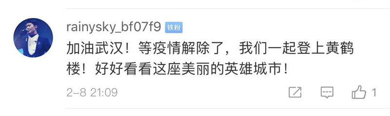 网友rainysky_bf07f9:“加油武汉!等疫情解除了,我们一起登上黄鹤楼!好好看看这座美丽的英雄城市!”