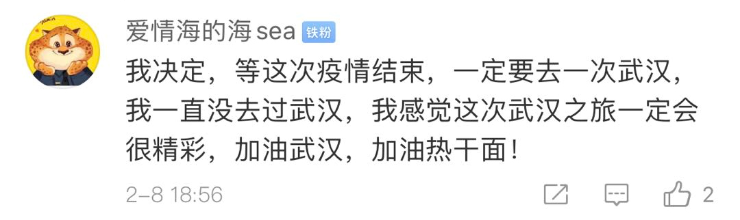 网友爱情海的海sea:“我决定,等这次疫情结束,一定要去一次武汉,我一直没去过武汉,我感觉这次武汉之旅一定会很精彩,加油武汉,加油热干面!”