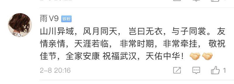 网友雨V9:“山川异域,风月同天,岂曰无衣,与子同裳。友情亲情,天涯若临,非常时期,非常牵挂,敬祝佳节,全家安康。祝福武汉,天佑中华!”