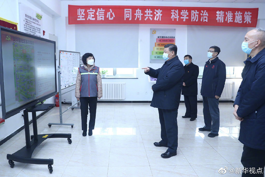 10日下午,习近平总书记来到北京市朝阳区安贞街道安华里社区,实地了解基层一线疫情群防群控等情况,并同在场的社区工作者亲切交流。他指出,新冠肺炎疫情防控工作是一场人民战争,要相信群众、发动群众,充分发挥社区在疫情防控工作中的“阻击作用”。继续推进疫情防控阻击战,需要充实社区的力量,把社区工作做得更加扎实。干部重心要下移,力量要下沉,支援社区工作,构筑起疫情防控的人民防线。(文字记者张晓松 摄影记者鞠鹏、庞兴雷)