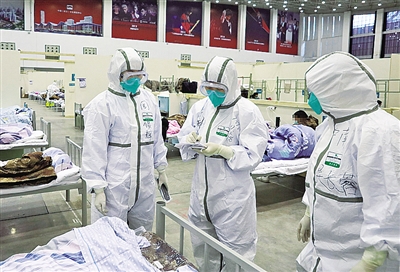 2月8日,医务人员在武汉客厅方舱医院查房。新华社发