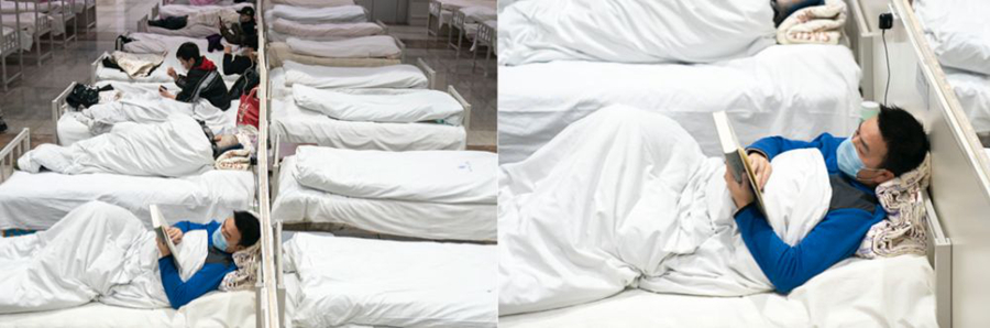 这些身影中还有被隔离的病人。江汉方舱医院启用的第一天,收治的首批病人里,有一个面目清秀的小伙子。入院躺下后,他打开了一本《政治秩序的起源》,安静地阅读。口罩遮住了他的表情,但却藏不住眼神里的平静和专注。看见我举起相机,他轻轻摆了摆手,示意不用拍他,我犹豫片刻,还是执意按下了快门。也许他并不明白,在有些喧嚣的方舱医院里,近乎静止的他,是多么的令人震撼。