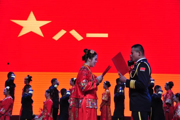 “我愿意像热爱军旗一样守护我们的爱情!” 2018年12月10日,火箭军某旅集体婚礼上,面对妻子汪慧婷,李哲右手握拳,说出爱的誓言。这次婚礼因执行任务而延误,从下高铁站、开始化妆、到步入礼堂……虽然期盼已久的婚礼有点儿“赶”,但那句诺言说出口时,满满的都是幸福。(马钰)