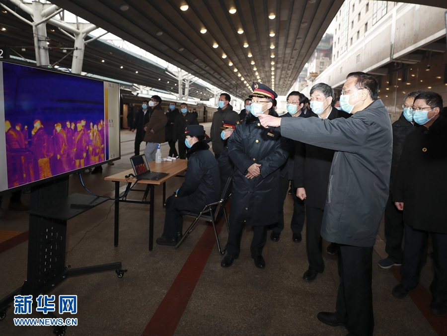 2月14日,中共中央政治局常委、国务院总理、中央应对新冠肺炎疫情工作领导小组组长李克强赴北京西站考察有序错峰返程和新冠肺炎疫情防控工作。 这是李克强察看车站红外测温设施运行情况。 新华社记者 丁林 摄