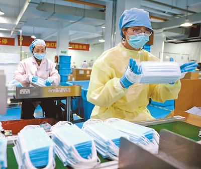 2月14日,在浙江长兴县和平镇一家无纺布制品公司口罩生产车间,员工们在整理口罩。许 旭摄(人民视觉)