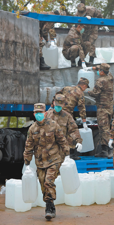 2月10日,河北邯郸市一家爱心组织为火神山医院捐赠的百吨医用消毒原液运抵武汉并予交接,图为医疗队队员在快速搬运医疗物资。范显海摄(新华社发)