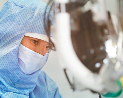 2月4日,福建晋江市一间无菌实验室,工人正在加紧生产防护服,为防疫一线提供物资保障。新华社记者 姜克红摄