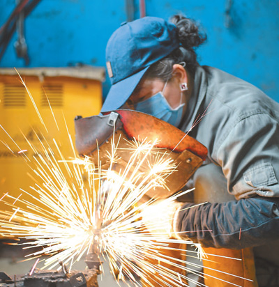 2月13日,江西瑞昌市一家公司的生产车间内,工人正在赶制负压救护车冲压配件。魏东升摄(影像中国)