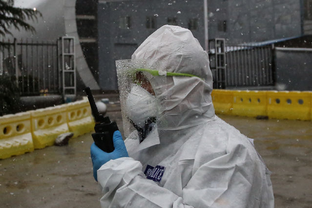 2月15日,武汉东西湖方舱医院,雪中的一名工作人员。中青报·中青网记者 赵迪/摄