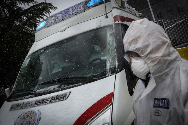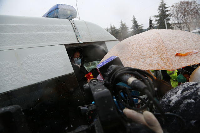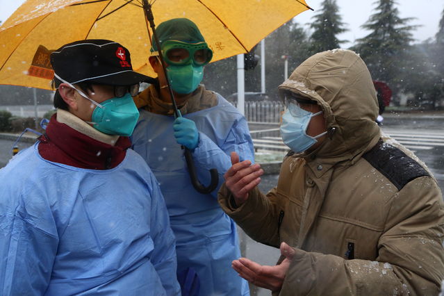 2月15日,武汉东西湖方舱医院,武汉大学中南医院副院长、东西湖方舱医院副院长李志强(左一)在雪中等待为治愈患者发放出院证明。中青报·中青网记者 赵迪/摄