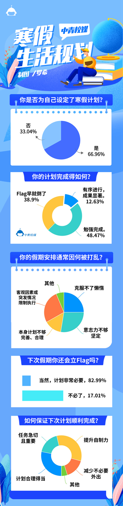 “发现自己需要提升的方面,据此做出计划,是一件好事。尤其在自主支配时间非常多的长假中,大学生尤其需要制定好计划,度过有意义的假期生活。”华东师范大学传播学院专职辅导员何柳萍说。调查显示,82.99%大学生认为制定计划非常必要。