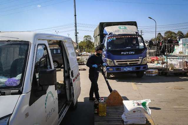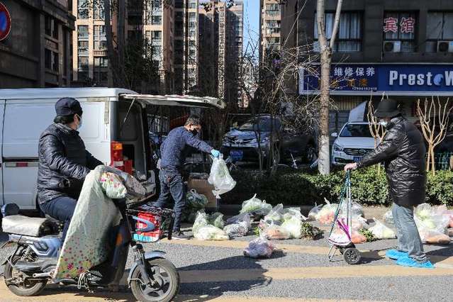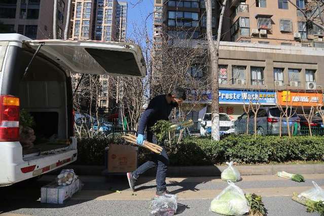 2月16日,湖北省武汉市,送菜小哥许可(中)在卸货。中青报·中青网记者 赵迪摄