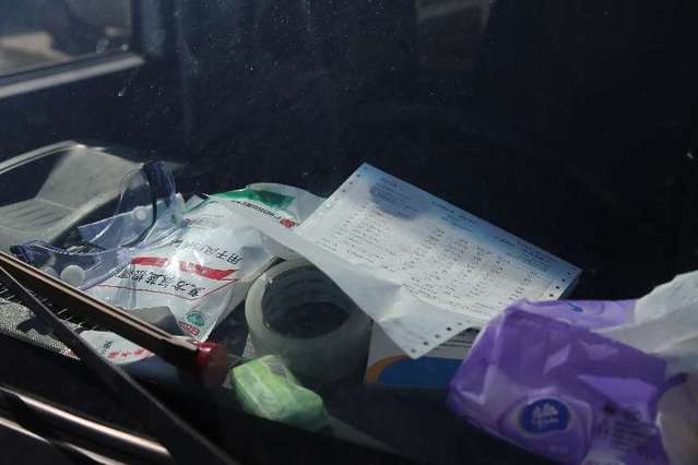 2月16日,湖北省武汉市,许可送菜车车窗旁的物品。中青报·中青网记者 赵迪摄