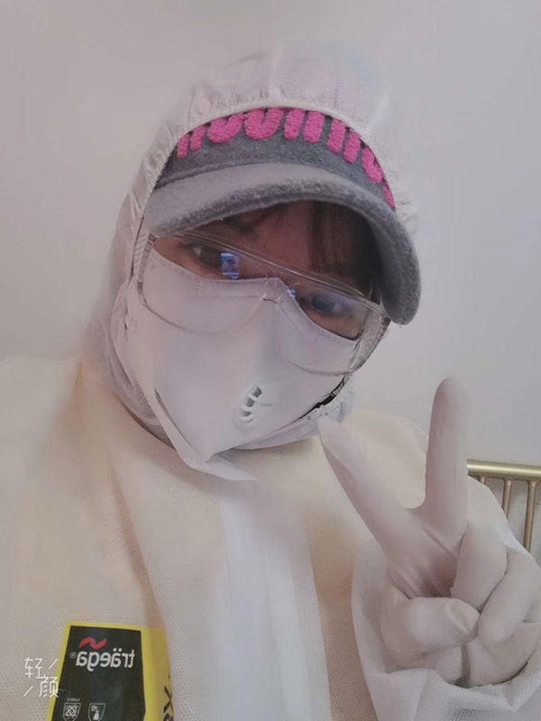 我出去心理压力也很大,所以我回来进门之前,消毒工作从头到脚,到鞋底都不放过。防护服那些在楼下脱下,拿个塑料袋装起来丢到垃圾桶。站在门外喷消毒液,我老公拿着“枪”对着我喷,感觉我的呼吸道都被消毒了。