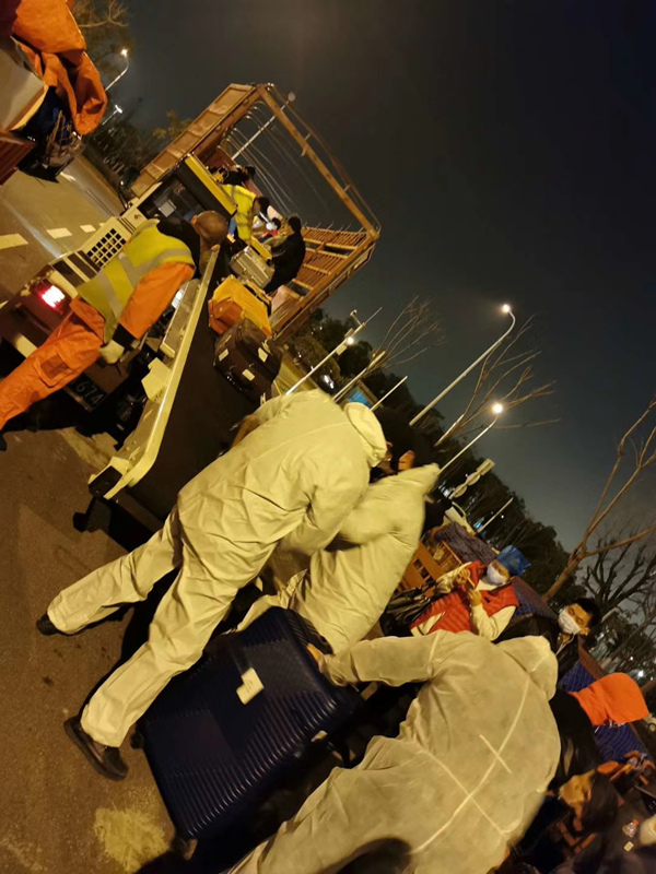 2月13日,(武汉)天河机场到了七架飞机,有1600个医护人员,从不同的城市过来,饭都没吃,站在那里冷飕飕的。他们有很多行李,机场的人手不够,我们就过来帮忙把这些行李运送到货车上,然后再送到他们相应的酒店,酒店会有志愿者帮忙卸行李。