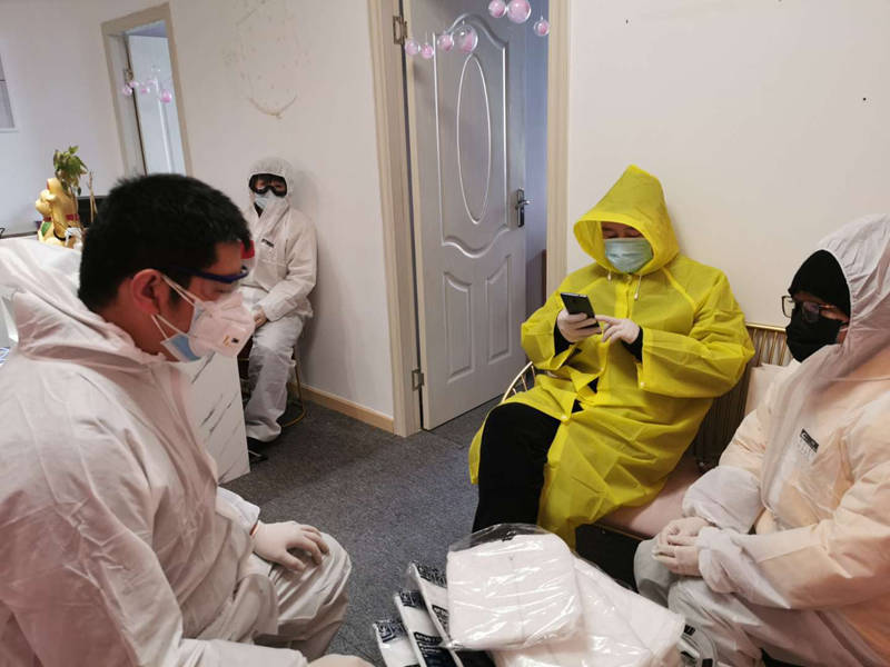 中午有别人赠送给我们的面包、牛奶、方便面,我们躲在一个房间凑合着弄一下,要不就不吃,能坚持就不吃。一天吃不了什么东西,而且又戴着口罩、穿着防护服。最后累得不想说话,坐着,发个呆,休息一会儿,然后再回家。