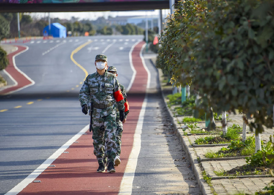 浐川村参与疫情防控的民兵在巡逻。新华社记者 胡虎虎 摄
