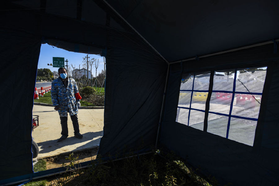 浐川村民秦如康在一条通村道路口值守。新华社记者 胡虎虎 摄