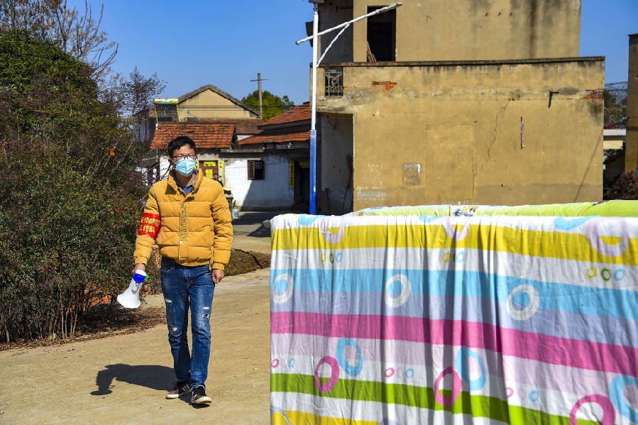 志愿者程浩在村庄来回播放录音,提示村民注意防护。新华社记者 胡虎虎 摄