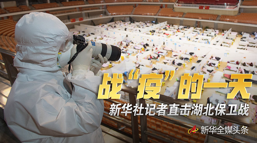 2月5日,武汉方舱医院收治首批患者,新华社记者熊琦在江汉方舱医院隔离区内采访拍摄。新华社发