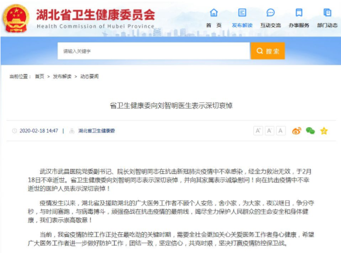 湖北卫健委18日发布通报表示,向刘智明同志表示深切哀悼,并向其家属表示诚挚慰问。向在抗击疫情中不幸逝世的医护人员表示深切哀悼。