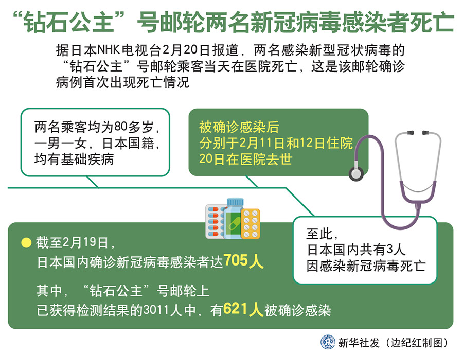 新华社东京2月20日电 据日本NHK电视台20日报道,两名感染新型冠状病毒的“钻石公主”号邮轮乘客当天在医院死亡,这是该邮轮确诊病例首次出现死亡情况。