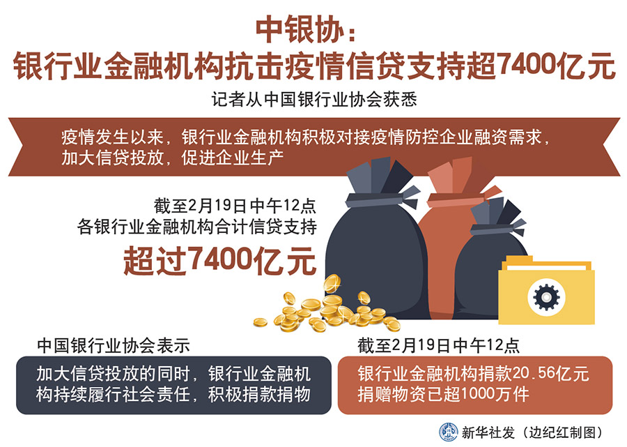 新华社北京2月20日电(记者李延霞)记者从中国银行业协会获悉,疫情发生以来,银行业金融机构积极对接疫情防控企业融资需求,加大信贷投放,促进企业生产。截至2月19日中午12点,各银行业金融机构合计信贷支持超过7400亿元。