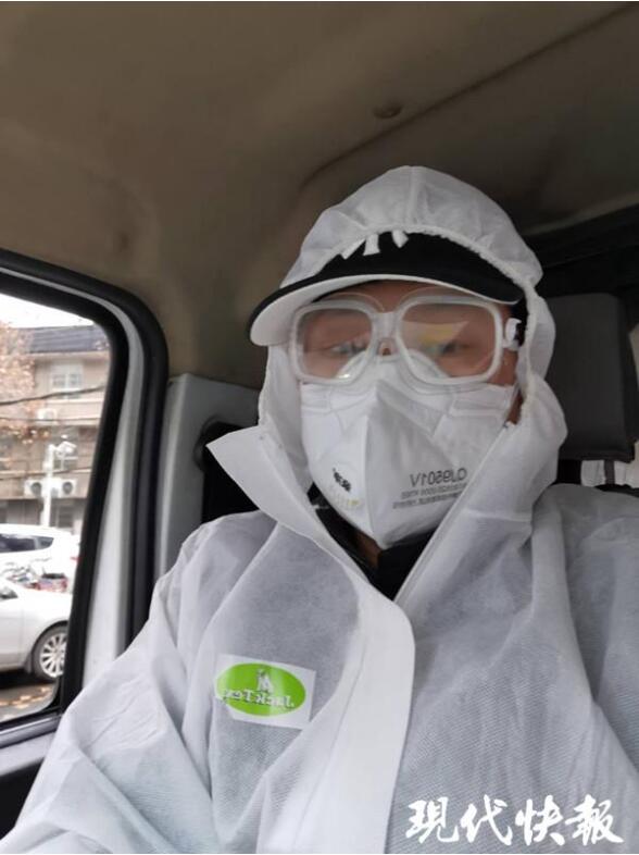虽然让我们尽量不要和病人接触,但是每次接送病人的时候,看见他们大包小包的,亲人也不能陪护,我就非常不忍心,能帮忙就尽量帮忙。而且我想,穿着防护服,戴着手套,不会有问题的。我还准备了一套“专用服装”,就在工作期间穿,每次洗都用 84 消毒,现在衣服都被烧坏了,成了红色的。