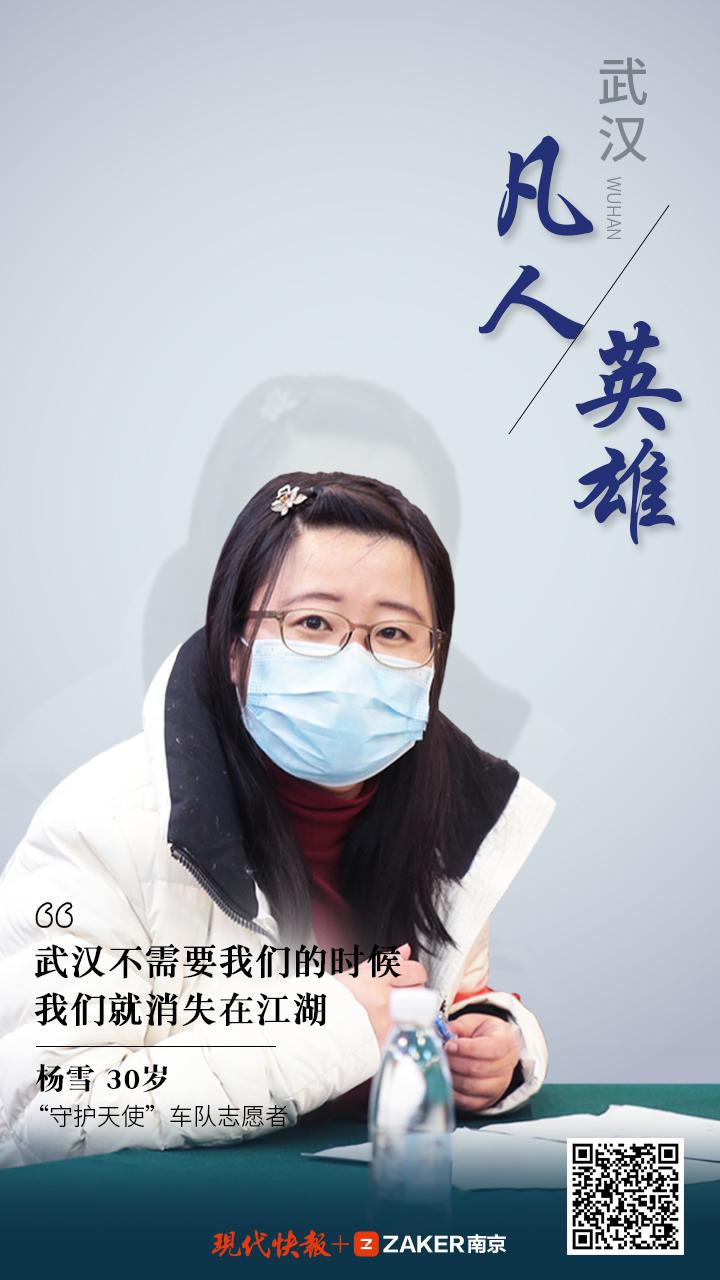 武汉封城后,杨雪做起了志愿者,和志同道合的人一起组建了 " 守护天使 " 志愿者车队,帮助接送医护人员以及转运物资。她说,武汉遇到了困难,我们需要为城市、为大家做的,是做好能做的每一件事情。