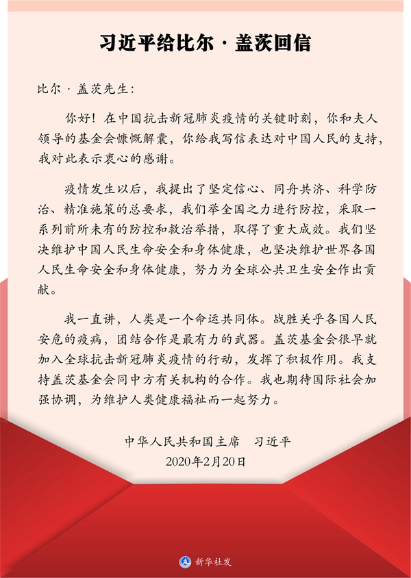 新华社北京2月22日电 国家主席习近平2月20日给美国盖茨基金会联席主席比尔·盖茨回信,感谢他和盖茨基金会对中国防控新冠肺炎疫情工作的支持,呼吁国际社会加强协调、共同抗击疫情。