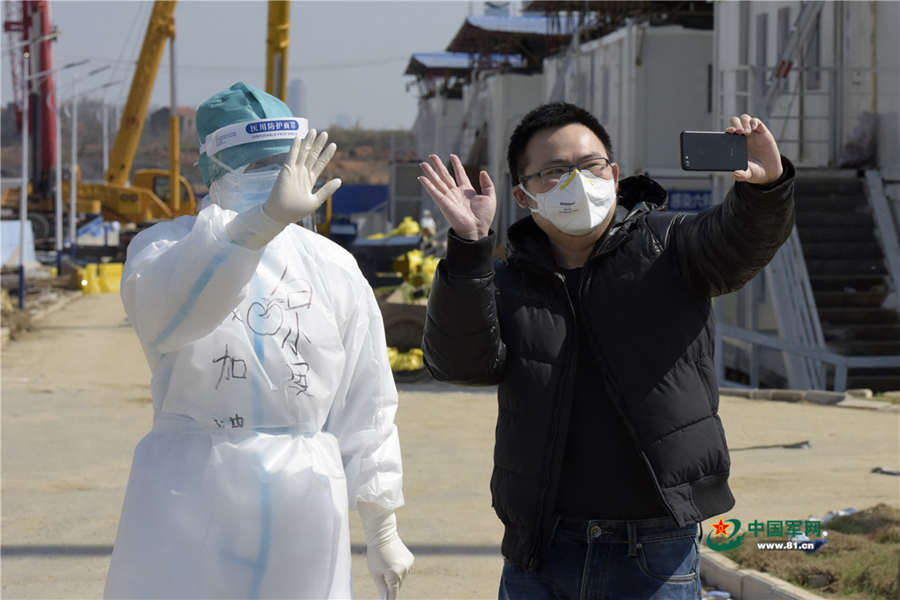 2月20日,治愈出院的万先生录制在火神山医院的最后一条短视频。中国军网记者范显海 摄