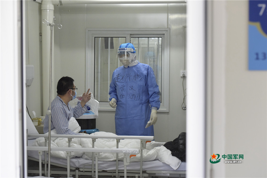 万先生向医护人员说明自己的身体情况。中国军网记者范显海 摄