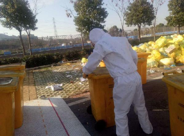 在武汉,虽然预想到任务不轻松,但现场情况还是让他们吃了一惊。由于垃圾房容量和条件有限,疫情期间量又非常大,老谢和队友们负责的两家医院很多垃圾只能露天摆放,加上处置人手不够,部分医疗废物还来不及按照规范放置在周转桶内。这给老谢他们的工作带来很大挑战。