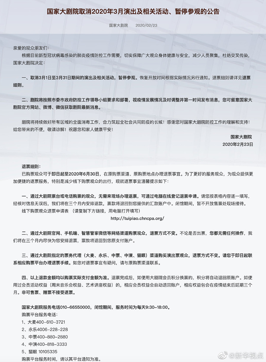 国家大剧院官网发布通告,取消3月1日至3月31日期间的演出及相关活动,暂停参观。恢复开放时间将根据实际情况另行通知。已购票观众可于即日起至2020年6月30日,在原购票渠道、原购票地点办理退票事宜。