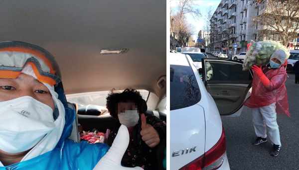 图为滴滴司机程科意接出院的社区居民回家(图左)程科意帮助搬运蔬菜(图右)