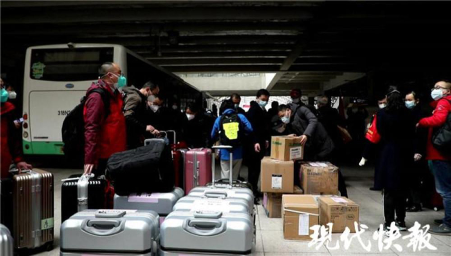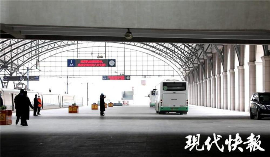 1 点 10 分,一列动车缓缓停靠在武汉汉口火车站,医疗队从车上搬下了二三十箱防护物资。
