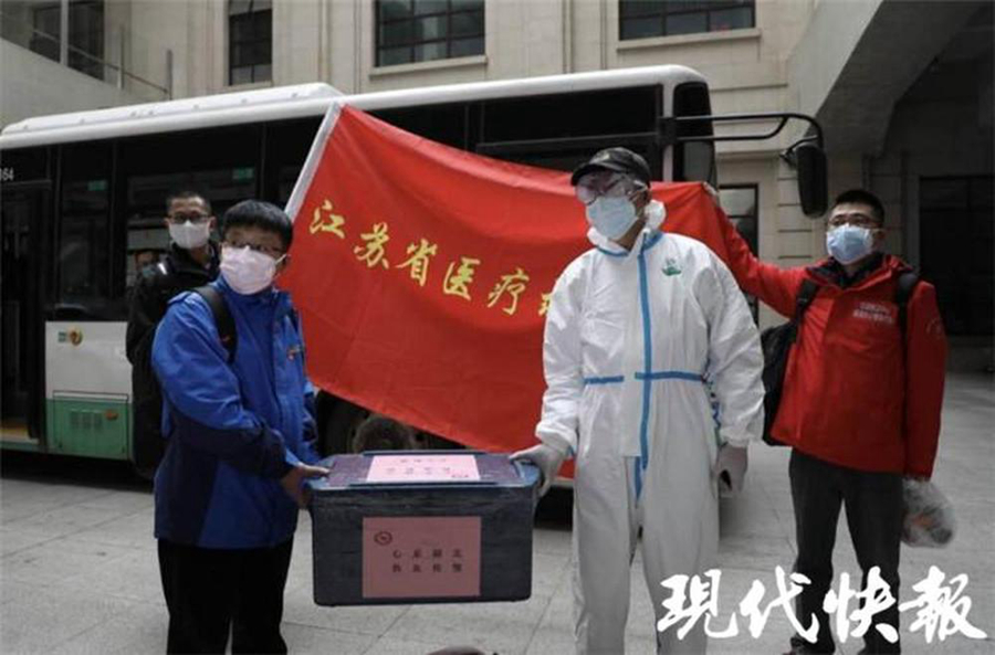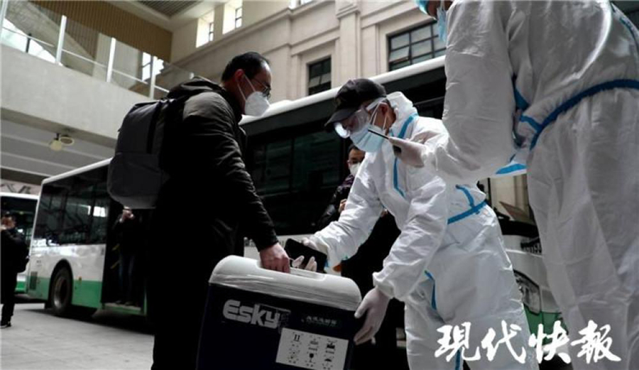 这次医疗队带来湖北最珍贵的物资,就是 3000 毫升救命血浆,是苏州、无锡、徐州、泰州等地的新冠肺炎康复者捐献的。在火车站的站台上,医疗队与黄石市中心血站副站长骆昡完成了交接。骆昡介绍,这些血浆将用于新冠肺炎危重患者救治,按照每人次使用 200 毫升计算,3000 毫升大概够十几位患者用。他把盛放着血浆的保温箱放到汽车上,随即出发,返回黄石市。(记者 是钟寅 拍摄 顾闻)